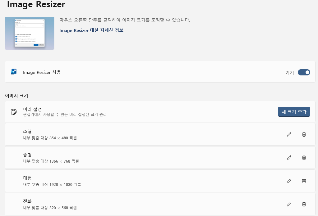 - Image Resizer : File Explorer에서 하나 이상의 이미지의 크기를 바로 조정할 수 있습니다.