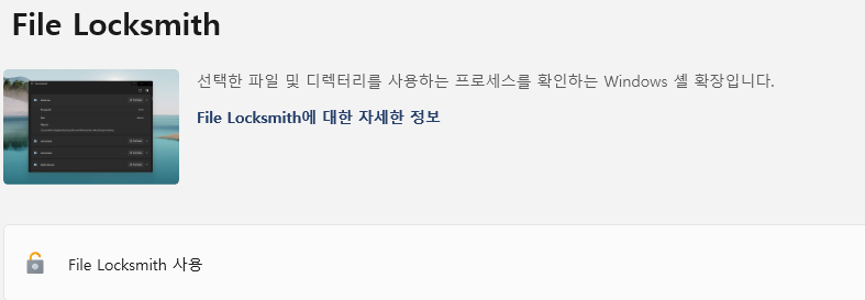 - File LockSmith : 사용 중인 파일 및 프로세스를 확인하기 위한 셸 확장입니다. 를 설치한 PowerToys후 파일 탐색기 하나 이상의 선택한 파일을 마우스 오른쪽 단추로 클릭한 다음 메뉴에서 '이 파일이 사용하는 항목은?' 을 선택합니다.