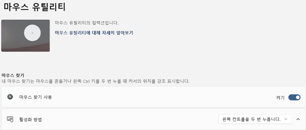 - 마우스 유틸리티 : 왼쪽 컨트롤을 두번 누르면 마우스 커서가 크고 동그랗게 하이라이트가 됩니다.
