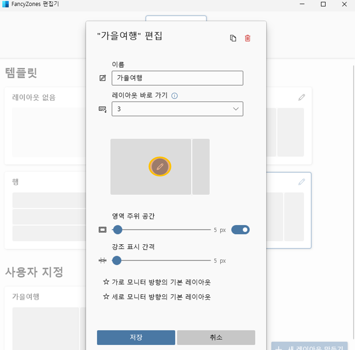 - FancyZones : 영역을 새롭게 만들고 이름을 지을 수 있습니다. 자주 사용하는 영역을 생성한 이후에 여러개의 창을 SHIFT 키를 누른채로 이동하면 원하는 영역에 크기와 위치에 맞게 배치할 수 있습니다.