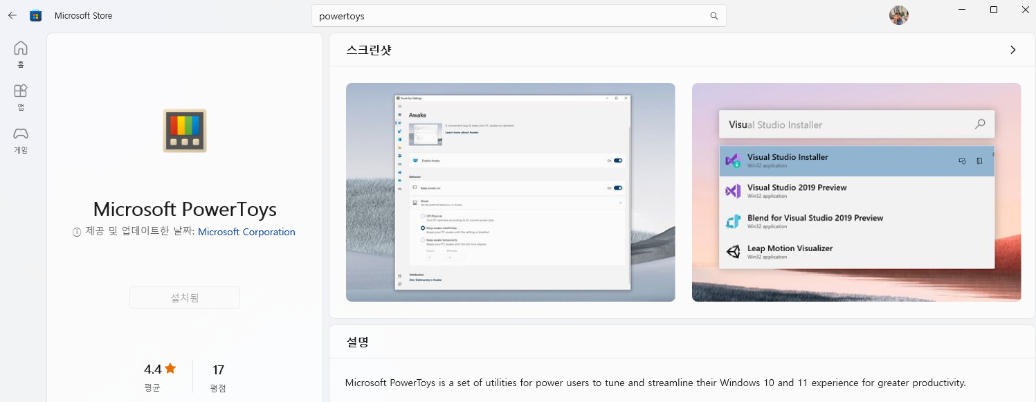 - MS Store 에 들어가서 'Powertoys' 를 검색합니다. [설치] 버튼 눌러서 진행하시면 됩니다.