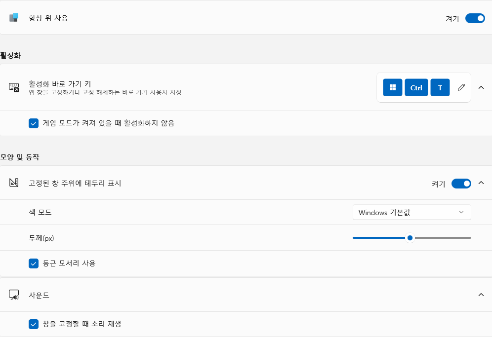- 윈도우 + Ctrl + T 단축키로 사용할 수 있으며 전체화면이 아닌 창으로 표시되는 어플리케이션에 대해 '항상 위' 기능을 강제로 활성화 시킬 수 있습니다.