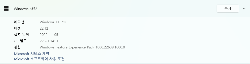 - 설정 -> 시스템 -> [정보]를 확인하면 윈도우10 / 11 Pro, Home, Enterprise 등을 확인할 수 있습니다.
