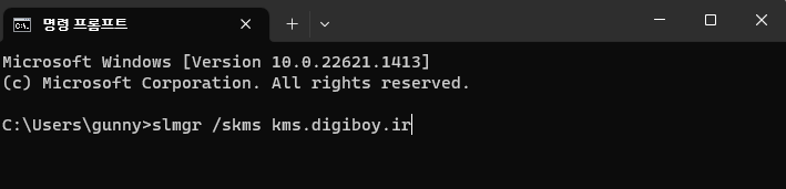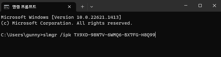 - 제품키 설치 명령입니다. 아래 명령을 그대로 복사해서 명령 프롬프트에 붙여넣기 합니다.