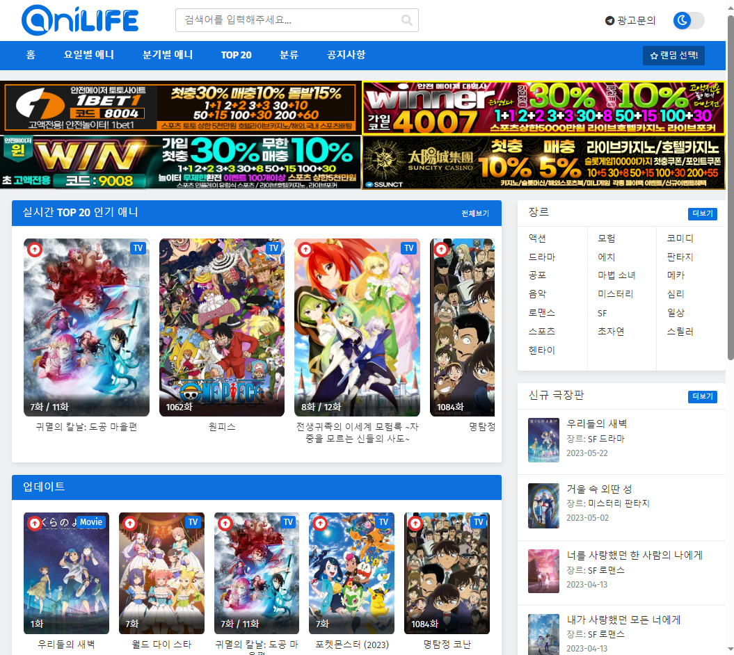 애니라이프 사이트는 제가 가장 많이 이용하는 애니메이션 무료 스트리밍 사이트입니다. 애니메이션에 따라서 여러가지 TV 모드를 제공하며 실시간 다시보기가 가능한 사이트입니다. 인기있는 애니메이션과 18+ 애니메이션, 극장판 애니메이션 등 다양한 작품을 제공하고 있습니다. 실시간으로 인기있는 TOP20 인기 애니를 확인할 수 있으며 최대 1080p 화질로 시청할 수 있습니다.