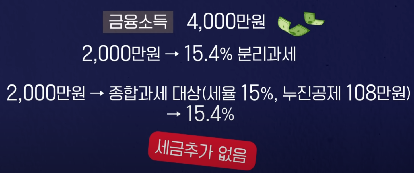 우선 첫 번째 사례입니다. 금융 소득만 4000만원이 있는 분을 한번 가정을 해보겠습니다. 금융소득 4000만원이면 굉장히 큰 액수입니다. 왜냐하면 이것은 이자와 배당 소득이 4000만원이란 얘기이기 때문에 이 부분은 상당히 많은 자산을 가지고 있다. 이렇게 보셔야 됩니다.