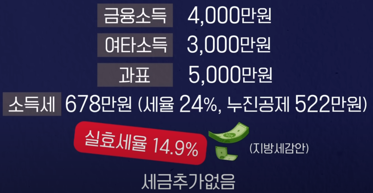 계산 결과, 이 경우에는 이 금융소득종합과세가 되면서 금융 소득에 대한 세부담이 바뀔까요? 아님 그대로 일까요? 우선 금융소득 4000만원에 대해서 2000만원까지는 비과세로 납세의무가 종료가 됩니다. 그리고 2천만원에 대해서만 이 종합소득세 대상이 되고요. 2000만원을 여타 소득 3천만원 합친 한마디로 과표 5000만원에 대해서 살펴보면 위 종합소득세율표 상에서 5천만원 소득구간은 24%에 해당합니다. 다만, 누진공제액 522원을 적용하면 678만원 대략 14.9% 세율에 해당하기 때문에 실제 세부담은 크지 않다는 것입니다.