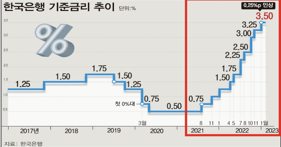 위 표는 한국의 기준 금리 표를 나타냅니다. 기준 금리는 이렇게 내려갔다가 올라갔다가 변동된다는 것을 알 수 있죠.