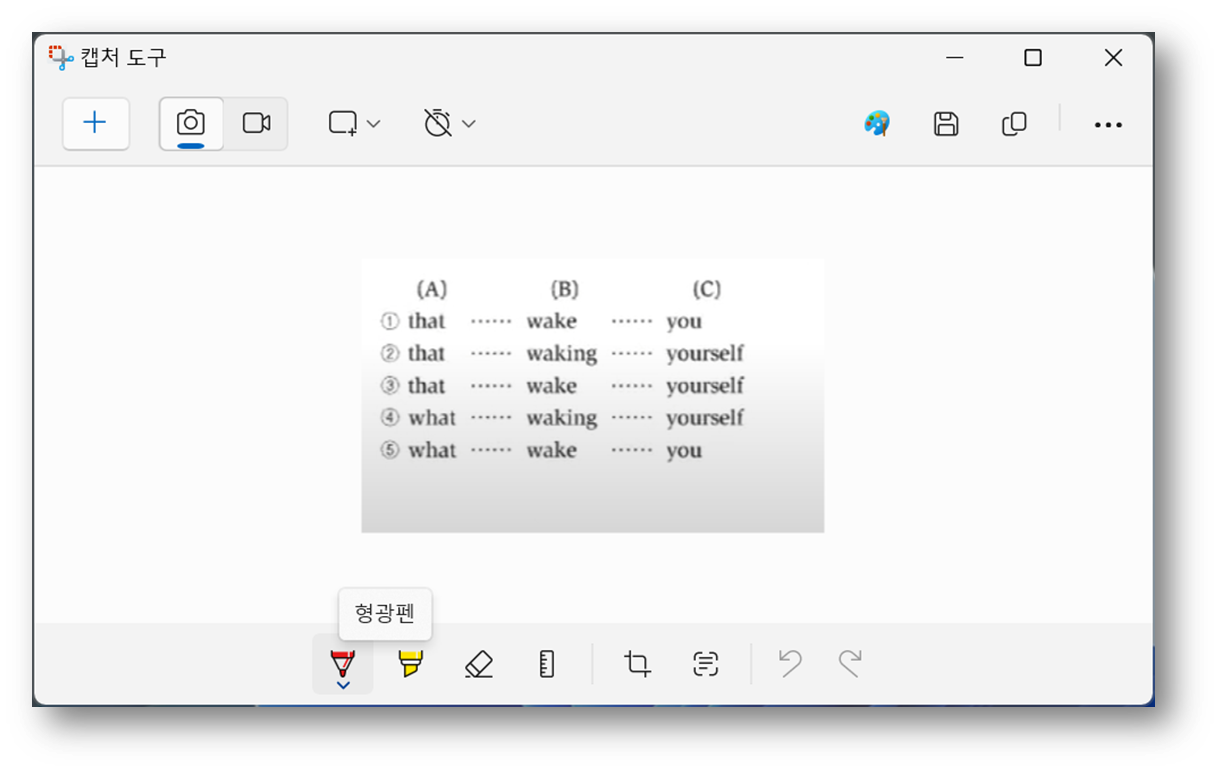 - 캡처된 이미지는 '캡처 도구' 창에 나타납니다. 여기서 형광펜, 볼펜, 지우개 등의 도구를 사용하여 이미지를 편집할 수 있습니다.