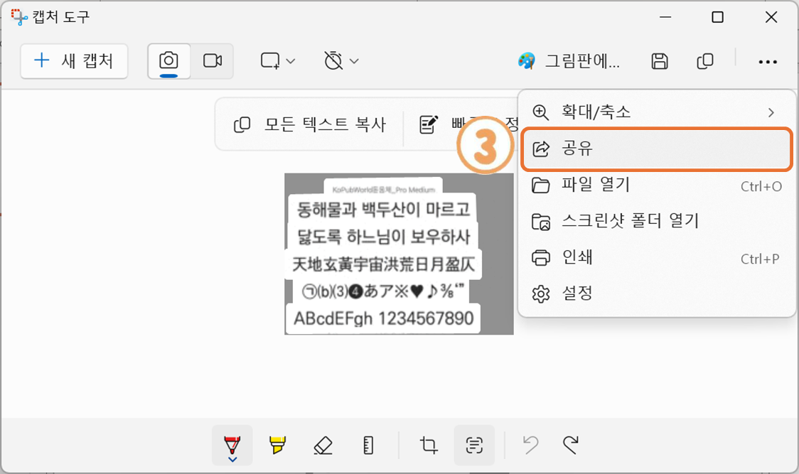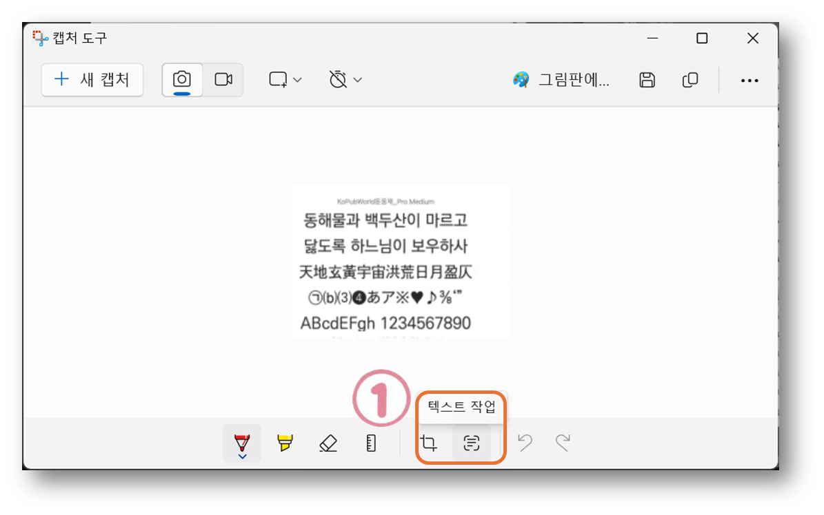 - 캡처 도구안에 캡처된 이미지가 나타나고 그 안에 텍스트가 있을 경우 아래 (1)와 같이 '텍스트 작업' 버튼을 누르세요.