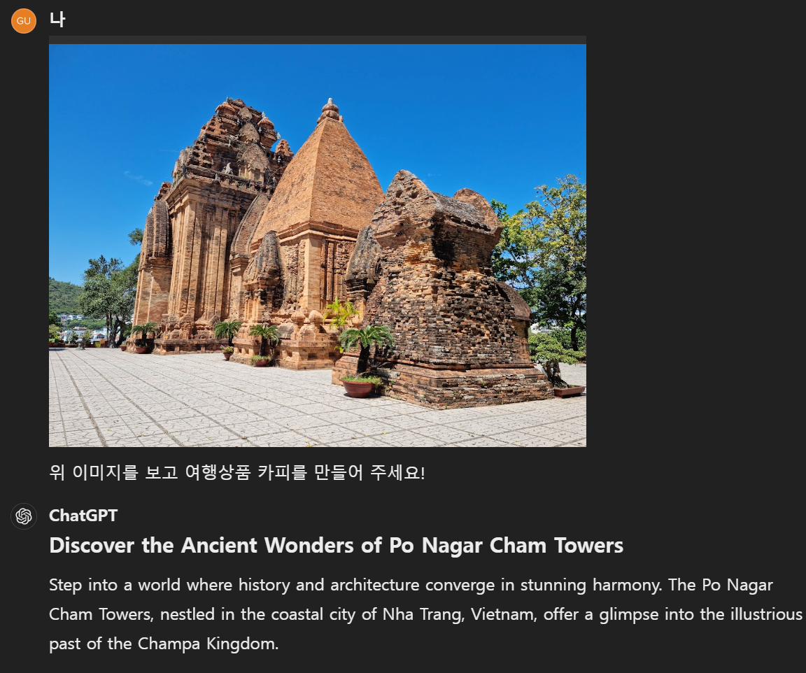 결과: 이미지속 건물를 인지해서 여행상품 광고 문구를 만들어 주네요. 이미지 분석 능력 뿐만 아니라, 컨텐츠 제작까지 가능하다는 걸 알 수 있어요!