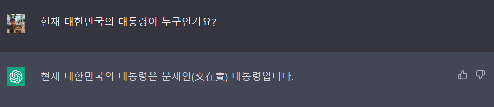 GPT-3 가 2021년 자료에 근거하고 있다는 것은 다음 질문에서 찾으실 수 있습니다.