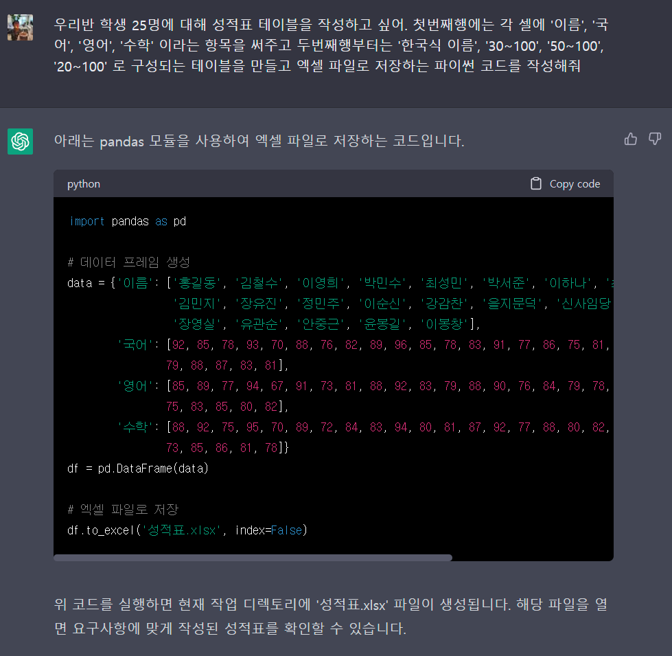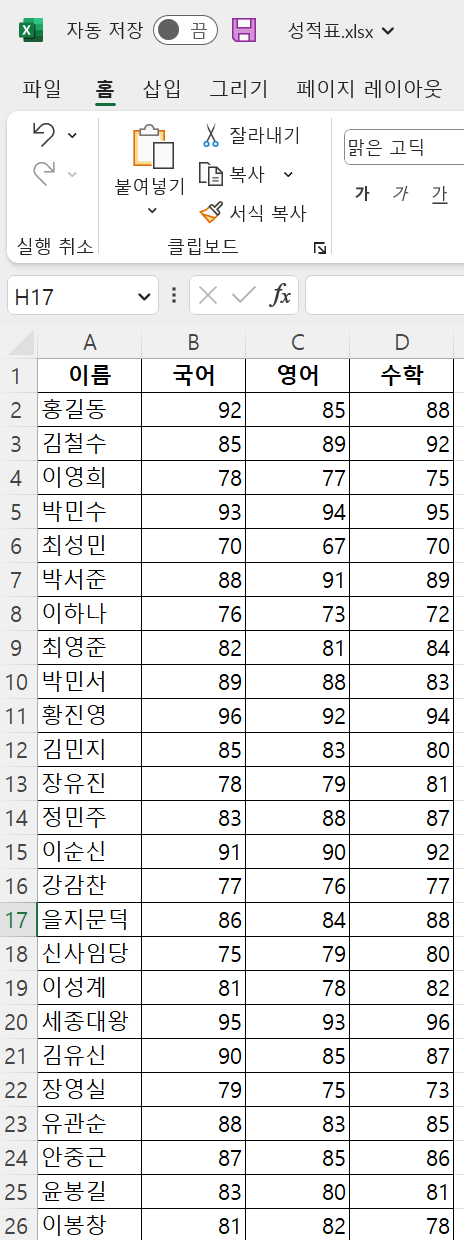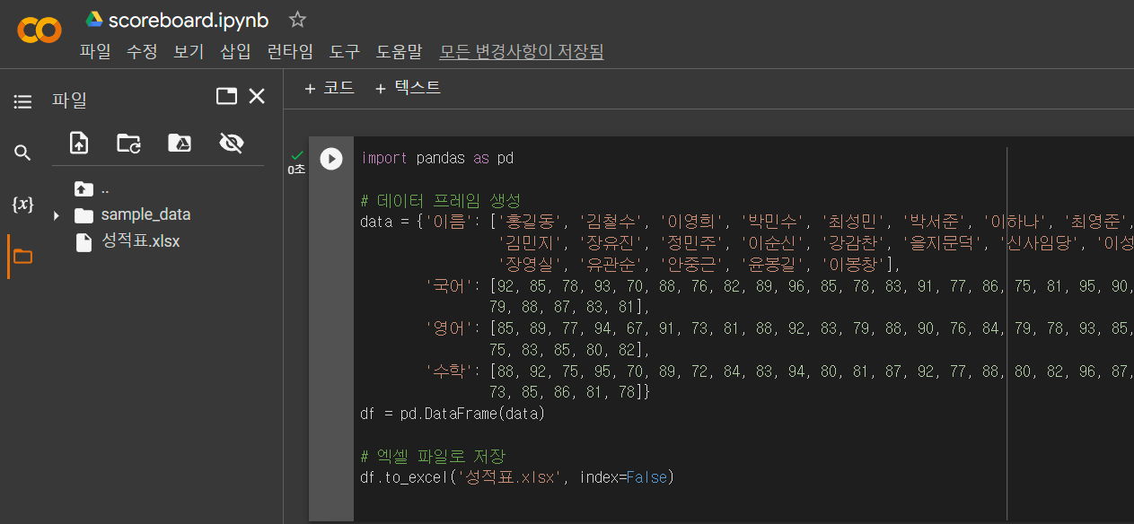 동일 폴더내에 '성적표.xlsx' 파일이 생성되었고 그 결과 아래와 같이 엑셀 테이블이 완성이 되었습니다.